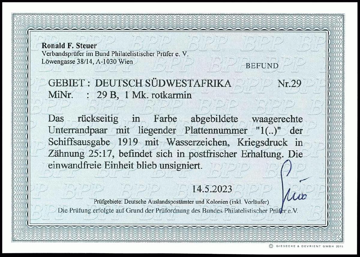 | Zusatzinformationen und Suchstichworte: | Dr. Reinhard Fischer 193. Auktion 21. - 22. Juli 2023 Los 3239 Deutsche Kolonien Südwestafrika 1 Mark Kaiseryacht, Kriegsdruck, 25 : 17 Zähnungslöcher, waagerechtes Paar vom Bogenunterrand mit Passerkreuz und Teil der Plattennummer "1...)", tadellos postfrisch, unsigniertes Luxusstück, Fotobefund R. F. Steuer BPP (2023): "einwandfrei", Mi. 640.-++ Ausruf 250,00 EUR |