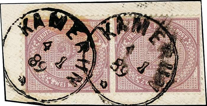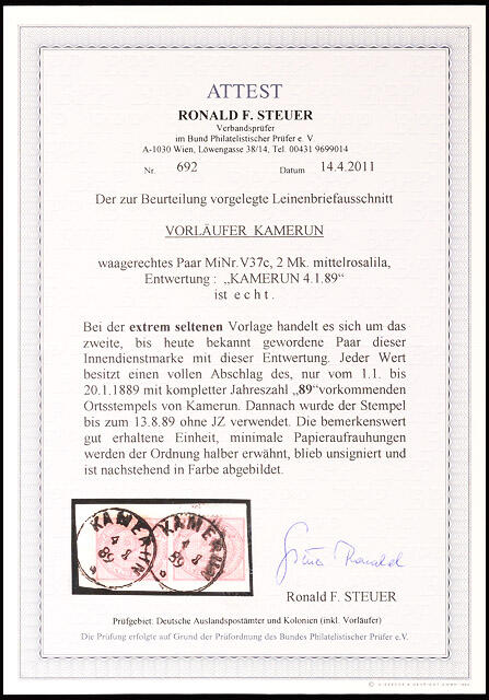 | Zusatzinformationen und Suchstichworte: | Dr. Reinhard Fischer 193. Auktion 21. - 22. Juli 2023 Los 3306 Deutsche Kolonien Kamerun, Vorläufer 2 Mark mittelrosalila, waag. Paar mit zwei vollen Stempeln KAMERUN 4 1 89 (mit Jahreszahl!!), Fotoattest Steuer BPP: "Bei der EXTREM SELTENEN Vorlage handelt es sich um das zweite bis heute (14.4.2011) bekannt gewordene Paar mit dieser Entwertung. Die Jahreszahl 89 wurde nur vom 1.1. bis 20.1. 1889 verwendet. ... bemerkenswert gut erhaltene Einheit." Laut Steuer-Handbuch Mi. x 10 = 30.000.- Ausruf 2.800,00 EUR |