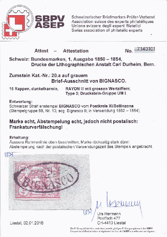 | Zusatzinformationen und Suchstichworte: | Marke echt, Abstempelung echt, jedoch nicht postalisch: Frankaturverfälschung! Siehe Attest 1877 von R. Berra-Gautschy (SBPV), der das Attest am 10.06.2013 wie folgt beschrieb: 15 Rp. rot, Type 3, Zumstein Nr. 20, auf Briefstück, ideal entwertet mit einem Tessiner Ovalstempel BIGNASCO, Nr. 13/Gruppe 68 des Stempelverzeichnisses. Marke echt, sauber und farbfrisch, dreiseitig breit gerandet, leicht berührt im oberen Rand, Papier ohne Fehler und nicht repariert. Sehr seltene Entwertung auf RAYON. https://www.briefmarken-atteste.de/atteste/suchen/ablage/167 Siehe Forumbeitrag https://www.philaseiten.de/cgi-bin/index.pl?ST=13131&CP=0&F=1 |
