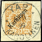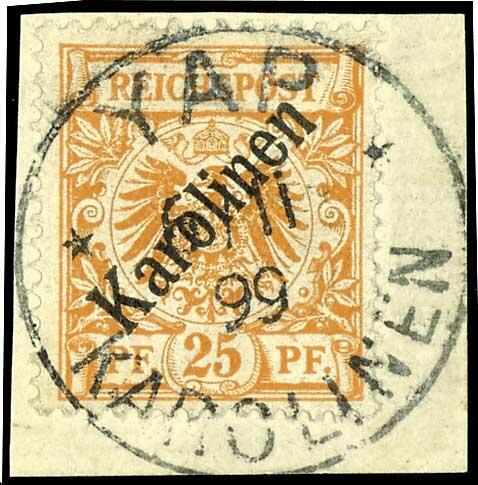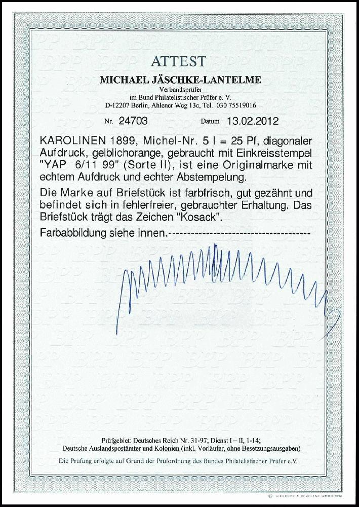 | Zusatzinformationen und Suchstichworte: | Dr. Reinhard Fischer 193. Auktion 21. - 22. Juli 2023 Los 3407 Deutsche Kolonien Karolinen 25 Pf Diagonalaufdruck tadellos und ideal zentrisch gestempelt "YAP 6/11 99", geprüft Kosack und Fotoattest Jäschke-Lantelme BPP: "Originalmarke mit echtem Aufdruck und mit echter Abstempelung Einkreisstempel Sorte II. Farbfrisch, gut gezähnt und in fehlerfreier, gebrauchter Erhaltung." Ausruf 500,00 EUR |