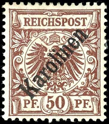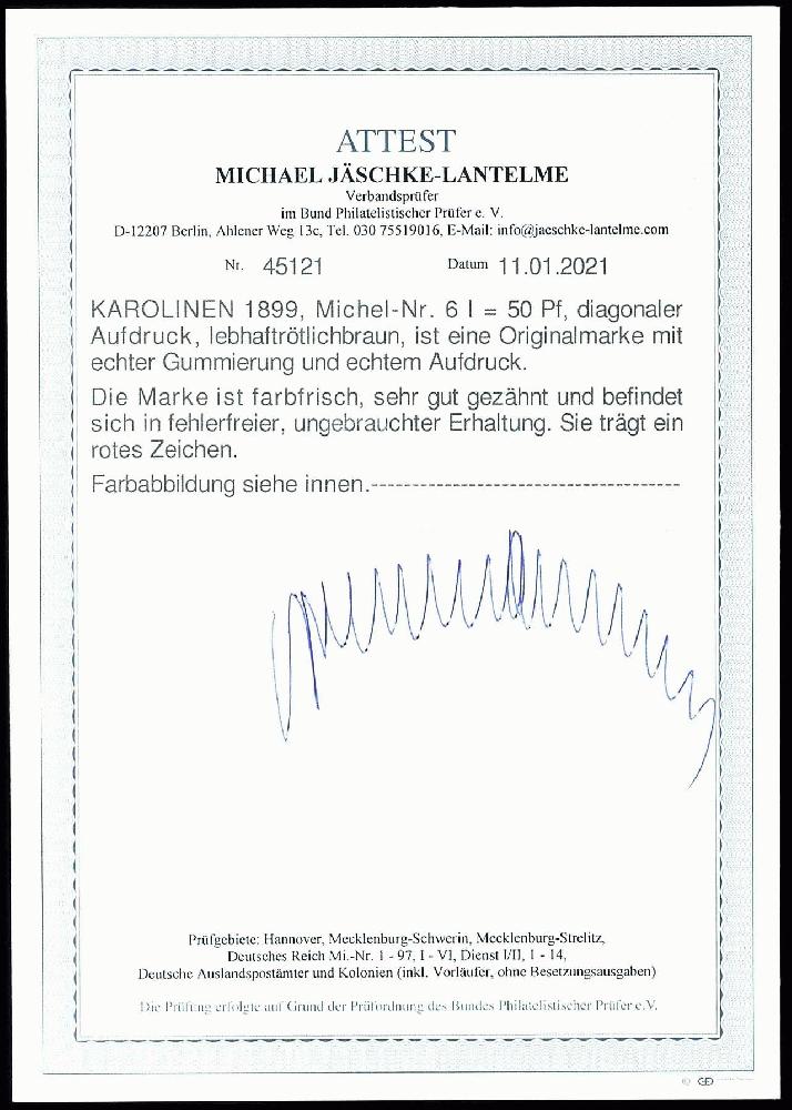 | Zusatzinformationen und Suchstichworte: | Dr. Reinhard Fischer 193. Auktion 21. - 22. Juli 2023 Los 3409 Deutsche Kolonien Karolinen 50 Pfg Krone/Adler mit diagonalem Bdr.-Aufdruck "Karolinen", tadellos ungebraucht mit Originalgummierung, Fotoattest Jäschke-Lantelme BPP (2021): "in fehlerfreier, ungebrauchter Erhaltung.", Mi. 800.- Ausruf 180,00 EUR |