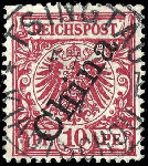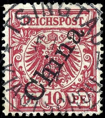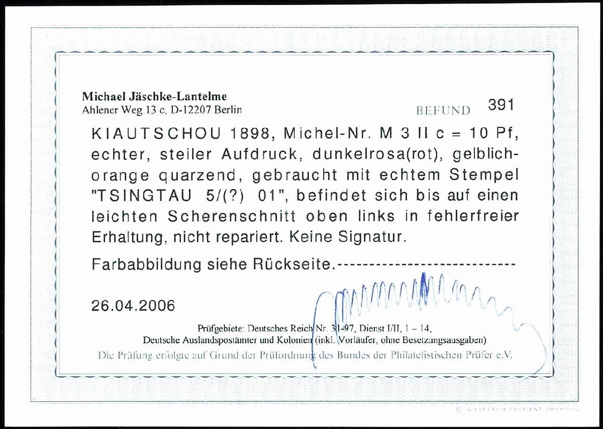 | Zusatzinformationen und Suchstichworte: | Dr. Reinhard Fischer 193. Auktion 21. - 22. Juli 2023 Los 3461 Deutsche Kolonien Kiautschou, Vorläufer 10 Pfennig Krone/Adler mit steilem Aufdruck "China", entwertet mit dem auf dieser Marke extrem seltenen Stempel "TSINGTAU b" (Steuer x 8", tadellose Erhaltung, Fotobefund Jäschke-Lantelme BPP, Mi./Steuer 1.840.- Ausruf 380,00 EUR |