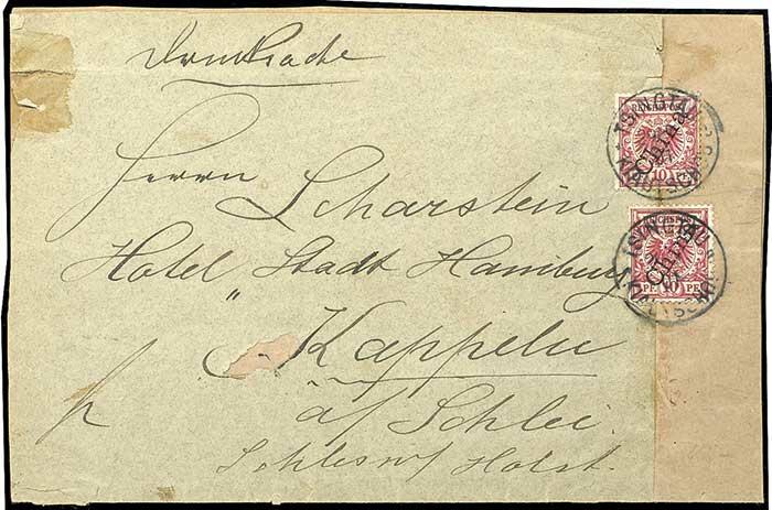 | Zusatzinformationen und Suchstichworte: | Dr. Reinhard Fischer 193. Auktion 21. - 22. Juli 2023 Los 3462 Deutsche Kolonien Kiautschou, Vorläufer Mitläufer 10 Pfennig dunkelrosa, gelblichorange quarzend, 2 fehlerfreie Werte in Mehrfachfrankatur, als Drucksache über 250 Gramm eine ungewöhnliche und sehr seltene Verwendungsform, entwertet "TSINGTAU *a", einige Beförderungsspuren sind laut Fotoattest kein Mangel, Fotoattest Jäschke-Lantelme BPP Ausruf 350,00 EUR |