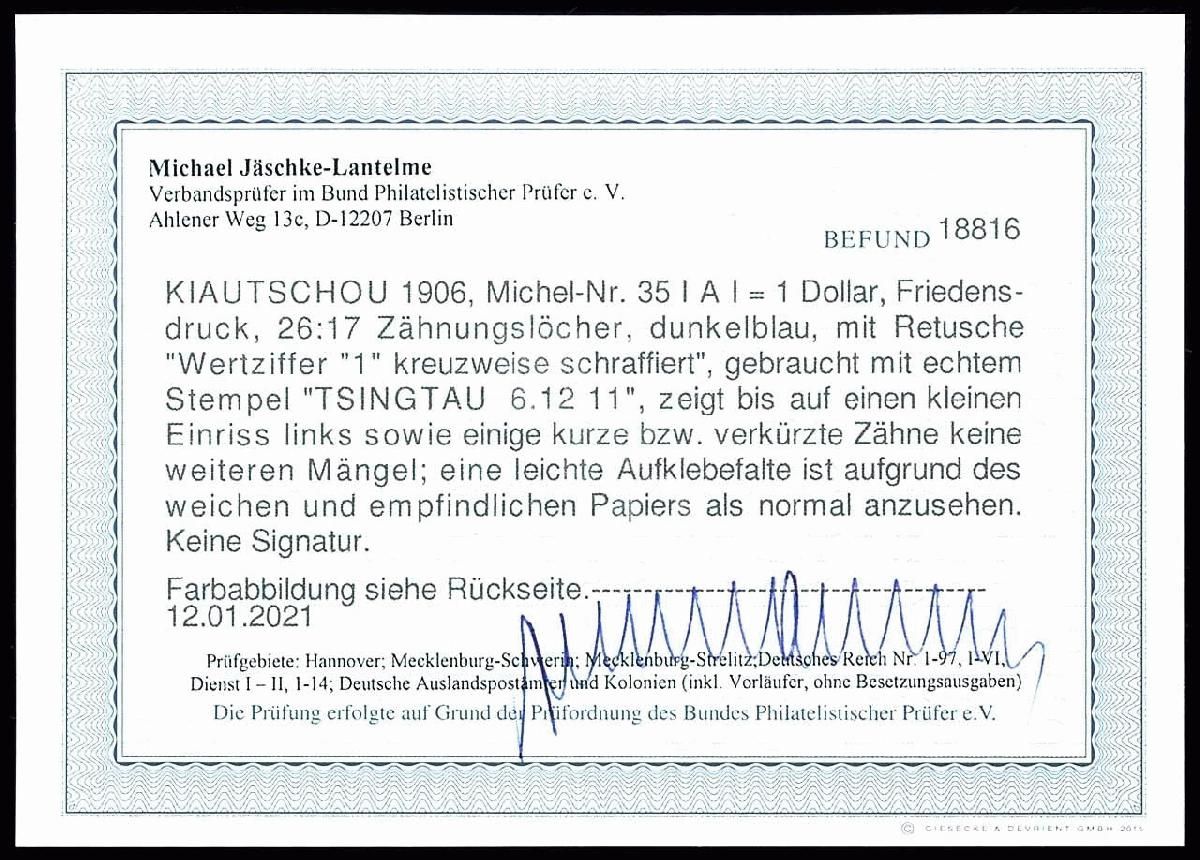 | Zusatzinformationen und Suchstichworte: | Dr. Reinhard Fischer 193. Auktion 21. - 22. Juli 2023 Los 3496 Deutsche Kolonien Kiautschou 1 Dollar Kaiseryacht, Friedensdruck, 26 : 17 Zähnungslöcher, Retusche "Wertziffer 1 kreuzweise schraffiert", entwertet "Tsingtau 6.12.11", kleiner Einriss links und kurze bzw. verkürzte Zähne, Fotobefund Jäschke-Lantelme BPP (2021), Mi. 500.- Ausruf 70,00 EUR |