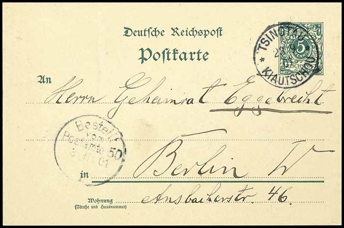 | Zusatzinformationen und Suchstichworte: | Dr. Reinhard Fischer 193. Auktion 21. - 22. Juli 2023 Los 3505 Deutsche Kolonien Kiautschou Ganzsache 5 Pfennig Krone/Adler, gestempelt " TSINGTAU KIAUTSCHOU * * ", langer Bedarfstext, kaum störender senkrechter Bug, Fotoattest Steuer BPP, Mi./Steuer 1.000.- Ausruf 250,00 EUR |