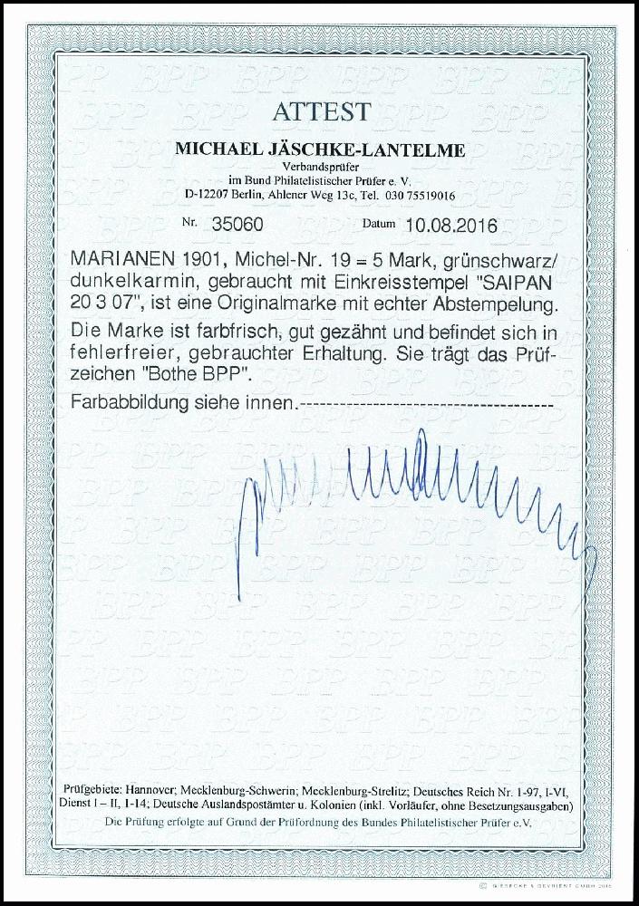 | Zusatzinformationen und Suchstichworte: | Dr. Reinhard Fischer 193. Auktion 21. - 22. Juli 2023 Los 3528 Deutsche Kolonien Marianen 5 Mark Kaiseryacht gestempelt "SAIPAN 20.3.07", tadellos, geprüft Bothe BPP, Fotoattest Jäschke-L. BPP, Mi. 600.- Ausruf 200,00 EUR |