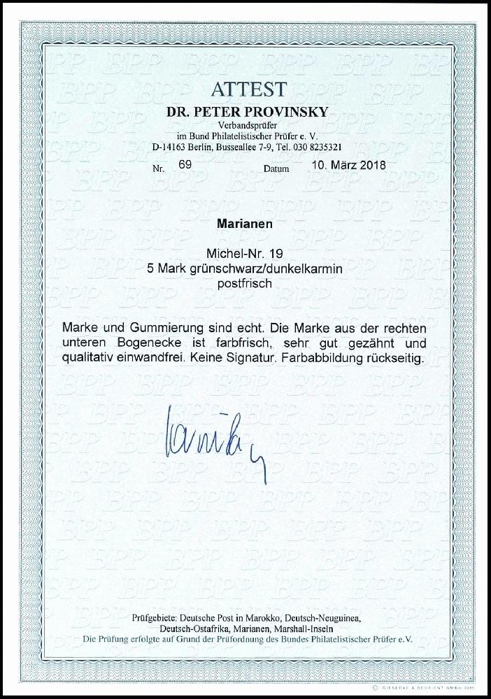| Zusatzinformationen und Suchstichworte: | Dr. Reinhard Fischer 193. Auktion 21. - 22. Juli 2023 Los 3530 Deutsche Kolonien Marianen 5 Mark Kaiseryacht, ohne Wasserzeichen, Eckrandstück unten rechts (Feld 20), tadellos postfrisch, unsigniert, Fotoattest Dr. Provinsky BPP (2018): "farbfrisch, sehr gut gezähnt und qualitativ einwandfrei.", Mi. 620.- Ausruf 300,00 EUR |