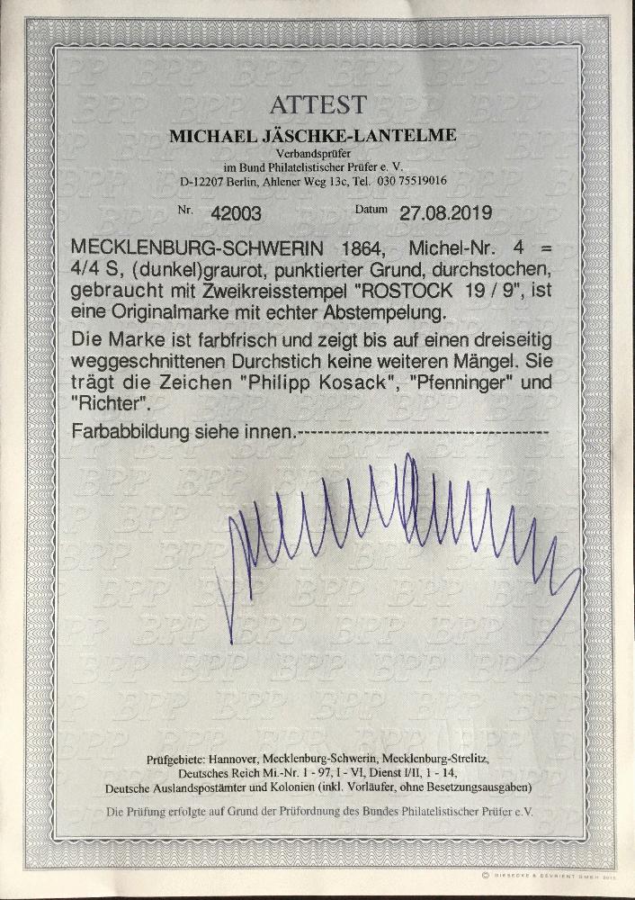 | Zusatzinformationen und Suchstichworte: | Bild Nummer 3, Rückseite der Marke, ist nicht Bestandteil des Attestes |