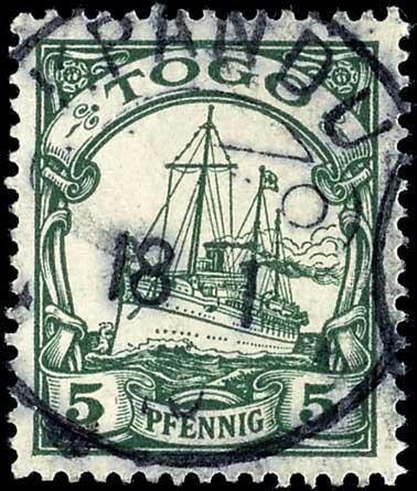 | Zusatzinformationen und Suchstichworte: | Dr. Reinhard Fischer 193. Auktion 21. - 22. Juli 2023 Los 3641 Deutsche Kolonien Togo KPANDU (TOGO) 18 1 10 - zentrischer Abschlag auf tadelloser 5 Pfg Kaiseryacht, Fotobefund Jäschke-Lantelme BPP (2018): "echt, in fehlerfreier Erhaltung." Ausruf 70,00 EUR |