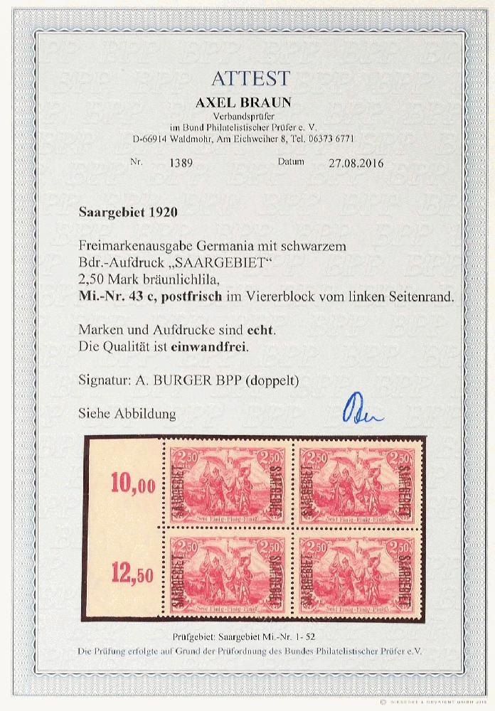 | Zusatzinformationen und Suchstichworte: | Dr. Reinhard Fischer 193. Auktion 21. - 22. Juli 2023 Los 4295 Saar 2,50 Mark Deutsches Reich, bräunlichlila, mit Aufdruck "Saargebiet", Viererblock vom linken Seitenrand mit Reihenzählern "10,00" und "12,50", tadellos postfrisch, gepr. Burger BPP und Fotoattest Braun BPP (2016): "Die Qualität ist einwandfrei.", Mi. 1.000.- Ausruf 250,00 EUR |