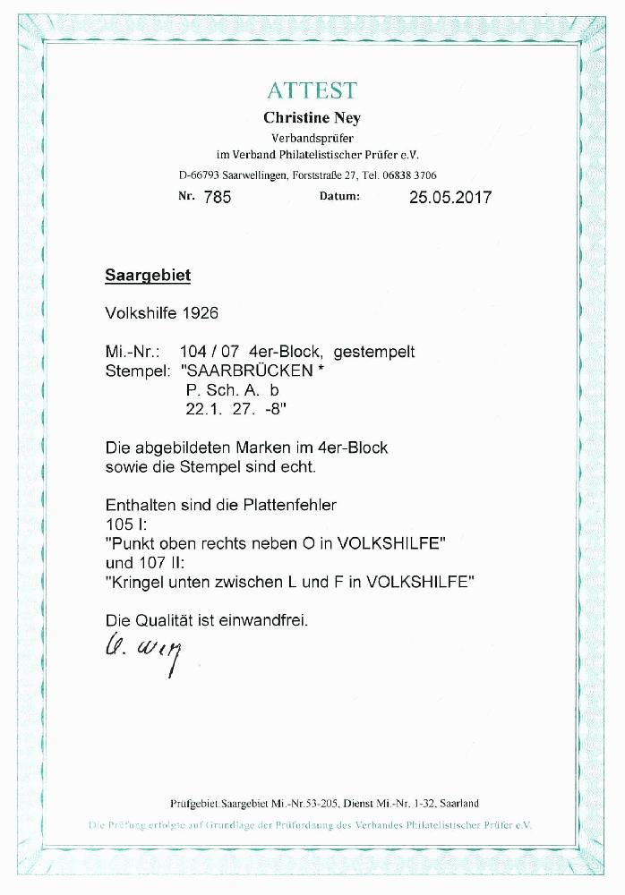 | Zusatzinformationen und Suchstichworte: | Dr. Reinhard Fischer 193. Auktion 21. - 22. Juli 2023 Los 4330 Saar 20 Cent bis 1,50 Fr. "Volkshilfe 1927: Pflegedienste (I)", Viererblocksatz inkl. Plattenfehler 105 I und 107 II, tadellos gestempelt "Saarbrücken * P. Sch. A. b 22.1.27", Fotoattest Ney VP (2017): "Die Qualität ist einwandfrei.", Mi. 1.140.-+ Ausruf 230,00 EUR |