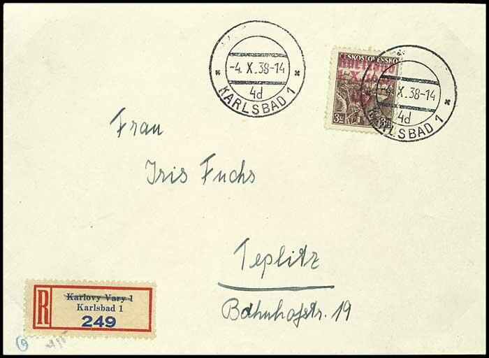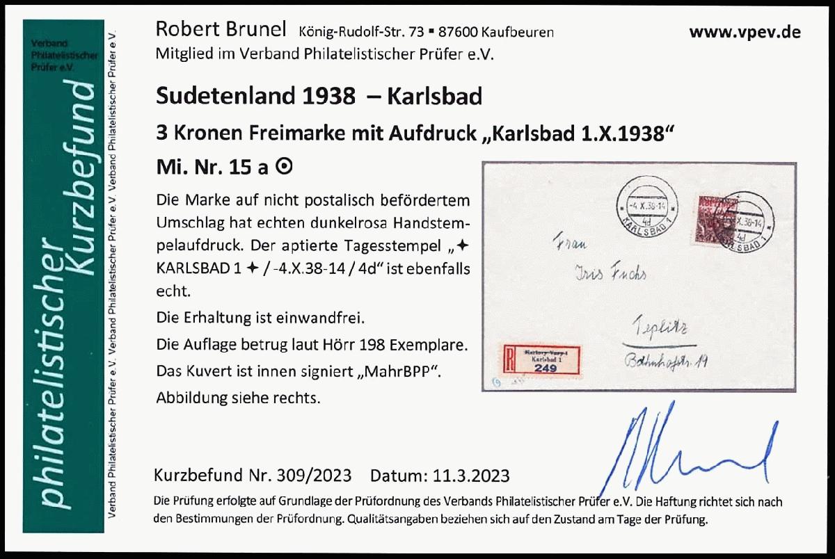 | Zusatzinformationen und Suchstichworte: | Dr. Reinhard Fischer 193. Auktion 21. - 22. Juli 2023 Los 4485 Sudetenland Karlsbad 3 Krone Freimarke mit dunkelrosanem Handstempelaufdruck "Karlsbad 1. X. 1938", entwertet "Karlsbad 1 4.X.38" auf postalisch nicht befördertem Umschlag, Auflage nur 198 Exemplare, gepr. Mahr BPP und Fotobefund Robert Brunel VP (2023): "Die Erhaltung ist einwandfrei.", Mi. 200.- Ausruf 75,00 EUR |