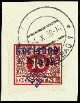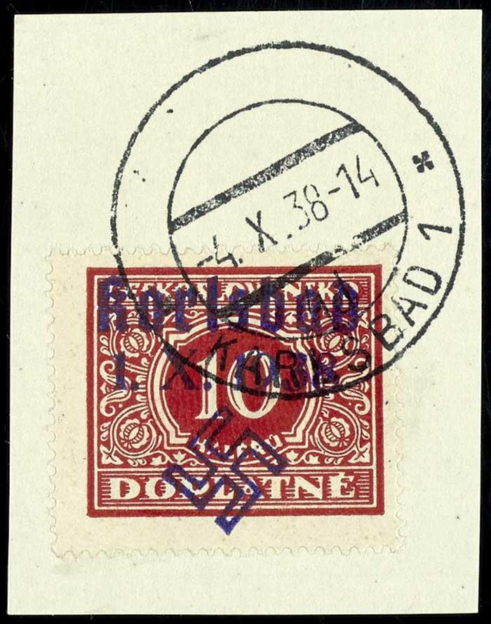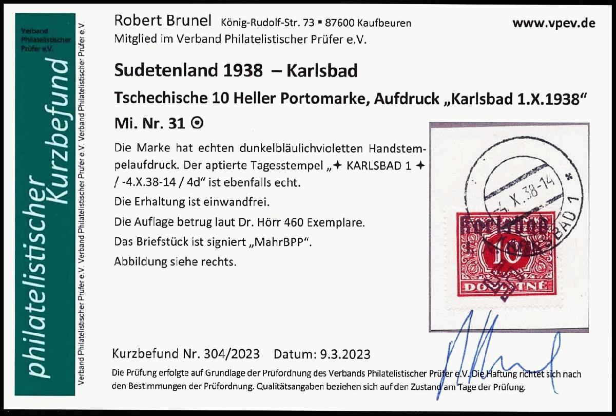 | Zusatzinformationen und Suchstichworte: | Dr. Reinhard Fischer 193. Auktion 21. - 22. Juli 2023 Los 4486 Sudetenland Karlsbad 10 Heller Portomarke mit Aufdruck "Karlsbad 1. X. 1938 + Hakenkreuz", gestempelt "+ Karlsbad 1 + / 4.X.38" auf Luxusbriefstück, Auflage nur 460 Exemplare, gepr. Mahr BPP und Fotobefund Robert Brunel VP (2023): "Die Erhaltung ist einwandfrei.", Mi. 65.- Ausruf 20,00 EUR |