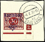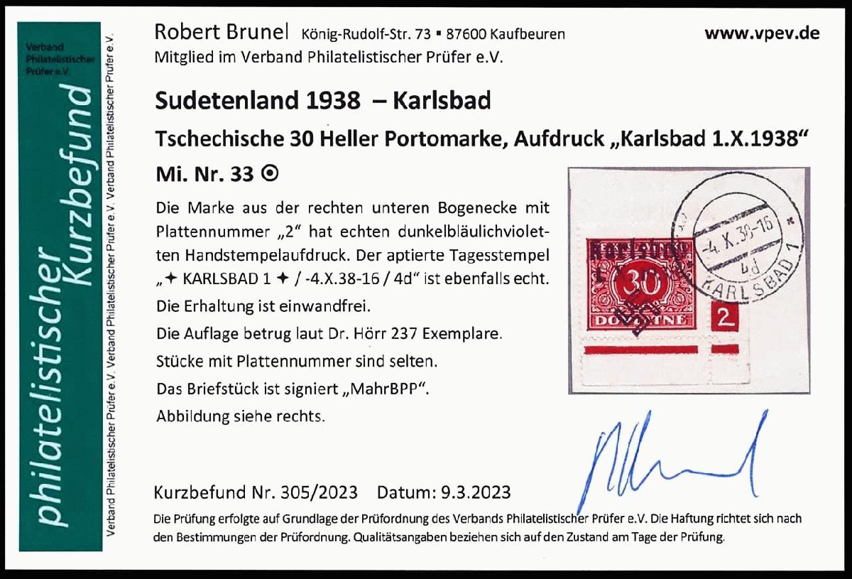 | Zusatzinformationen und Suchstichworte: | Dr. Reinhard Fischer 193. Auktion 21. - 22. Juli 2023 Los 4487 Sudetenland Karlsbad 30 Heller Portomarke mit Aufdruck "Karlsbad 1. X. 1938 + Hakenkreuz", Eckrandstück unten links mit Plattennummer "2", gestempelt "+ Karlsbad 1 + / 4.X.38" auf Luxusbriefstück, Auflage nur 237 Exemplare - davon nur wenige Stücke mit Plattennummer überhaupt möglich, gepr. Mahr BPP und Fotobefund Robert Brunel VP (2023): "Die Erhaltung ist einwandfrei. Stücke mit Plattennummer sind selten." Ausruf 400,00 EUR |