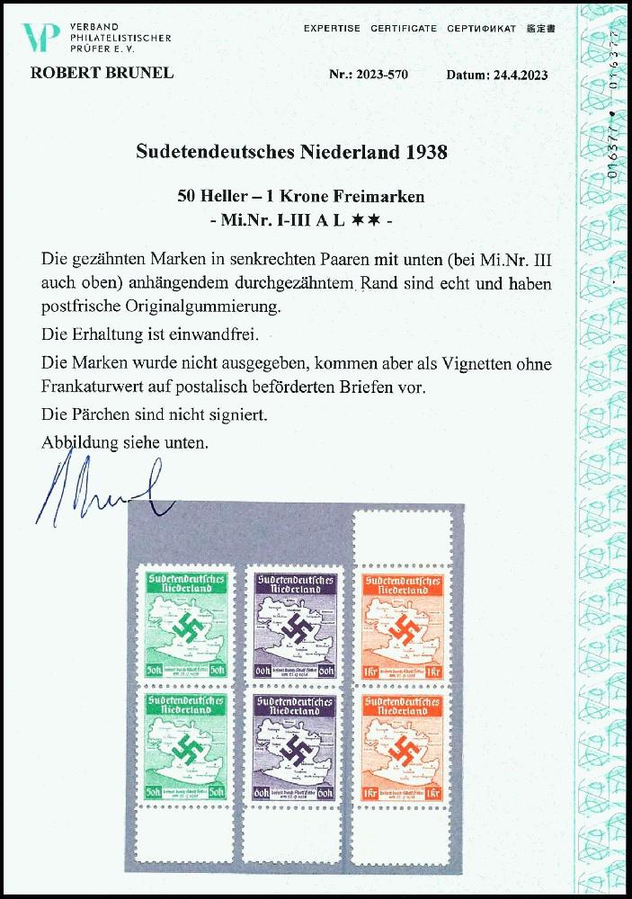 | Zusatzinformationen und Suchstichworte: | Dr. Reinhard Fischer 193. Auktion 21. - 22. Juli 2023 Los 4509 Sudetenland Nicht ausgegeben: 50 H. - 1 Kr. Freimarken, gezähnt, drei Werte komplett, je als senkrechtes Paar mit unten anhängendem Leerfeld und bei der 1 Kr. auch oben anhängendem Leerfeld, tadellos postfrisch, unsigniert, geringe Auflage, Expertise Robert Brunel VP (2023) "...echt und haben postfrische Originalgummierung. Die Erhaltung ist einwandfrei.", Mi. 1450.- - unterbewertet! Ausruf 600,00 EUR |