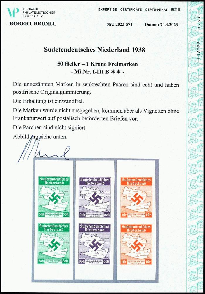 | Zusatzinformationen und Suchstichworte: | Dr. Reinhard Fischer 193. Auktion 21. - 22. Juli 2023 Los 4510 Sudetenland Nicht ausgegeben: 50 H. - 1 Kr. Freimarken, geschnitten, drei Werte komplett, je als senkrechtes Paar, tadellos postfrisch, unsigniert, geringe Auflage, Expertise Robert Brunel VP (2023) "...echt und haben postfrische Originalgummierung. Die Erhaltung ist einwandfrei.", Mi. 1.200.- - unterbewertet! Ausruf 500,00 EUR |