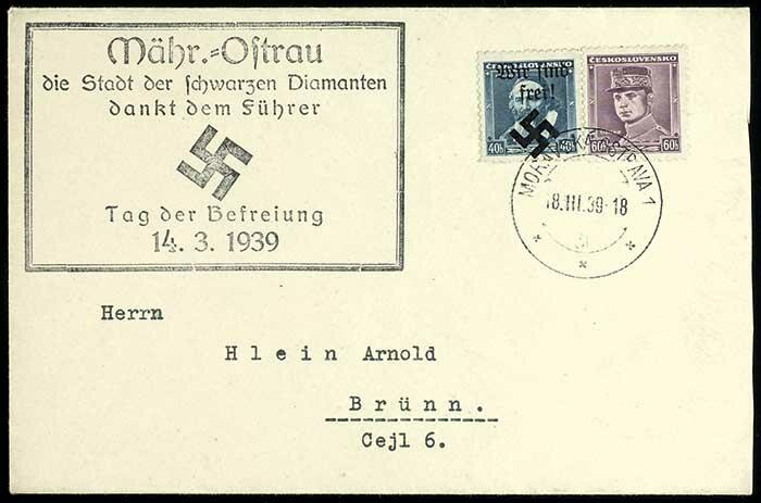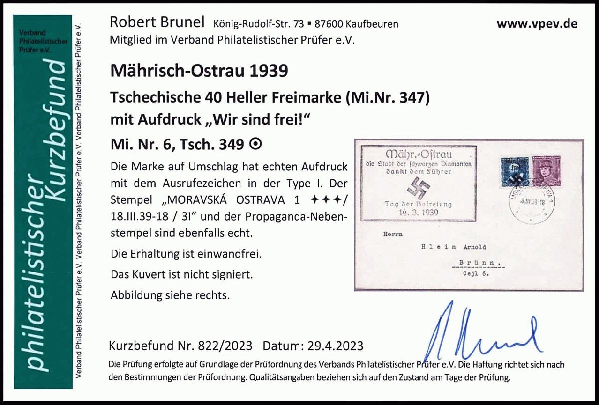 | Zusatzinformationen und Suchstichworte: | Dr. Reinhard Fischer 193. Auktion 21. - 22. Juli 2023 Los 4526 Böhmen und Mähren Mährisch-Ostrau 40 Heller mit Aufdruck "Wir sind frei! + Hakenkreuz"; entwertet "Moravska Ostrava 1 *** 18.III.39" auf Umschlag mit Propaganda-Nebenstempeln, Fotobefund Robert Brunel VP (2023): "Die Erhaltung ist einwandfrei." Ausruf 30,00 EUR |