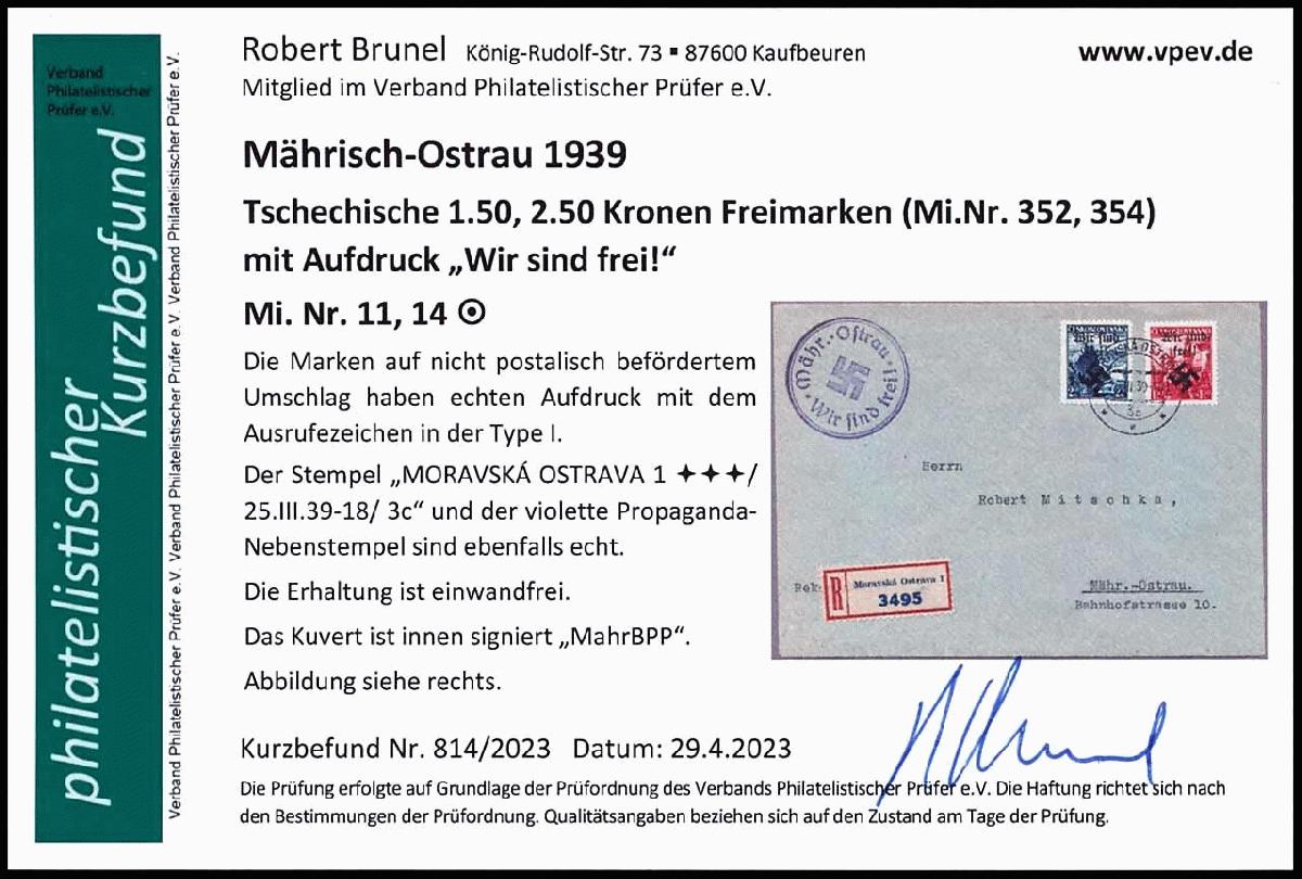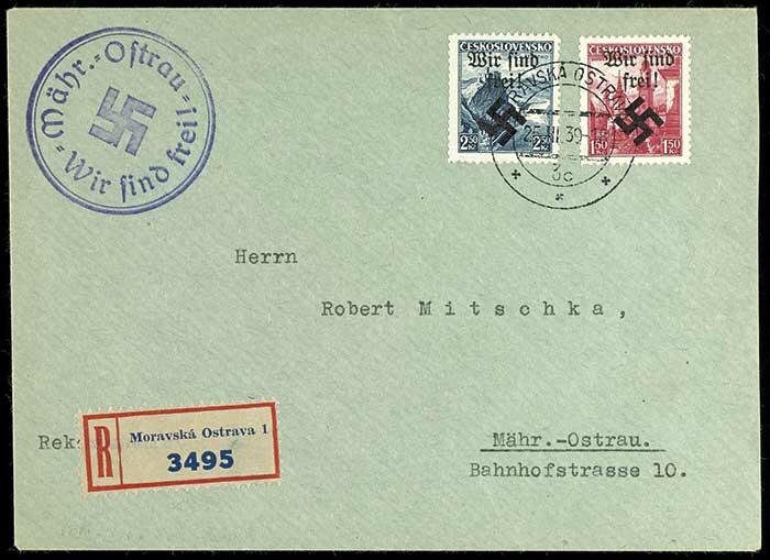 | Zusatzinformationen und Suchstichworte: | Dr. Reinhard Fischer 193. Auktion 21. - 22. Juli 2023 Los 4530 Böhmen und Mähren Mährisch-Ostrau 1.50 Kc. und 2,50 Kc. mit Aufdruck "Wir sind frei! + Hakenkreuz"; entwertet "Moravska Ostrava 1 *** 25.III.39" auf Umschlag mit Propaganda-Nebenstempel, Fotobefund Robert Brunel VP (2023): "Die Erhaltung ist einwandfrei." Ausruf 70,00 EUR |