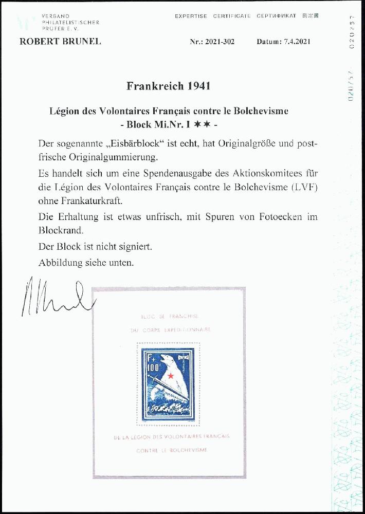 | Zusatzinformationen und Suchstichworte: | Dr. Reinhard Fischer 193. Auktion 21. - 22. Juli 2023 Los 4578 Deutsche Besetzung II. WK Französische Legion Blockausgabe "Eisbär", Originalformat, postfrisch, unsigniert, Expertise Brunel VP (2021): "Die Erhaltung ist etwas unfrisch, mit Spuren von Fotoecken im Blockrand", Mi. 800.- Ausruf 130,00 EUR |