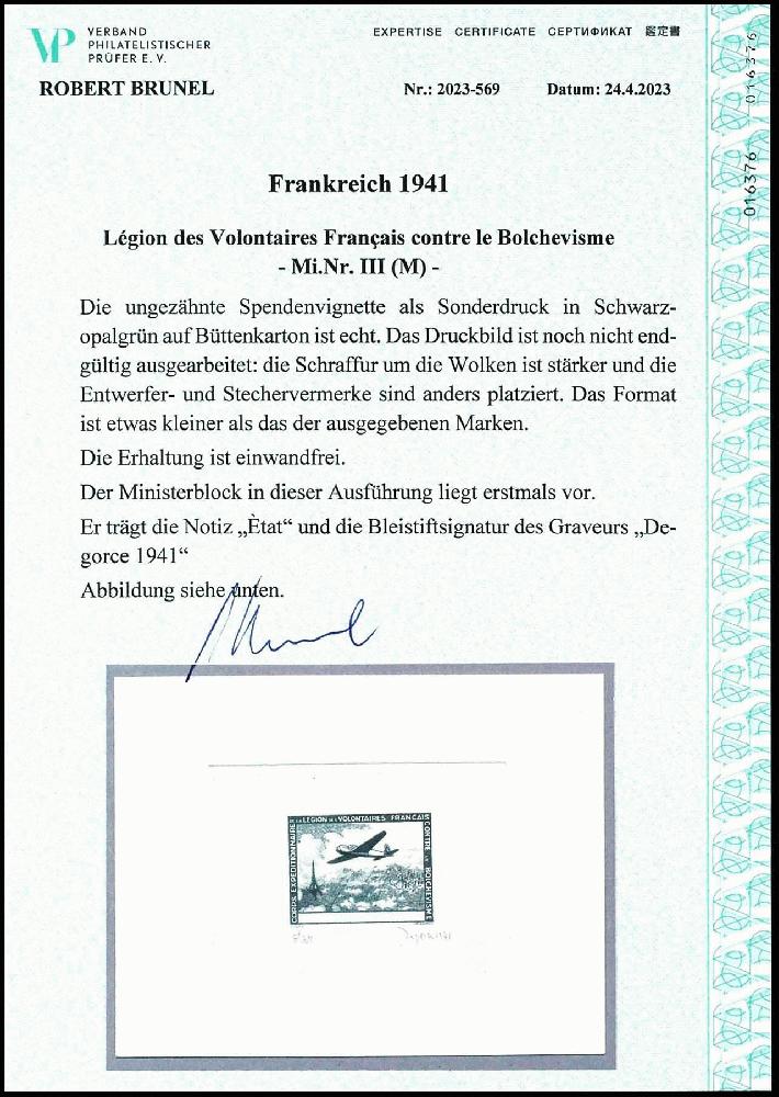 | Zusatzinformationen und Suchstichworte: | Dr. Reinhard Fischer 193. Auktion 21. - 22. Juli 2023 Los 4587 Deutsche Besetzung II. WK Französische Legion Ministerblock in schwarzopalgrün auf Büttenkarton, Erstausführung - das Druckbild ist noch nicht vollständig ausgearbeitet - die Schraffur um die Wolken ist stärker und die Entwerfer- und Stechervermerke sind anders platziert. das Format ist etwas kleiner als das der ausgegebenen Marken, er trägt die Bleistiftsignatur des Graveurs Degorce 1941 sowie eine Notiz "État", tadellose Erhaltung, sehr selten, Expertise Robert Brunel VP (2023): "Die Erhaltung ist einwandfrei. Der Ministerblock in dieser Ausführung liegt erstmals vor.", Mi. in dieser Form nicht gelistet Ausruf 1.500,00 EUR |