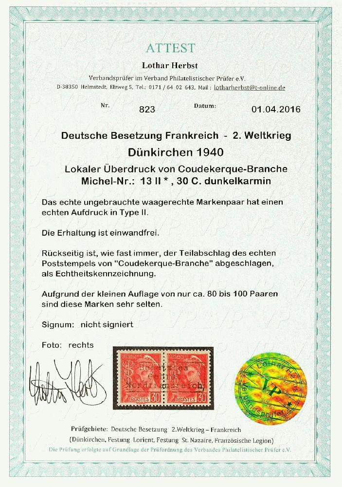 | Zusatzinformationen und Suchstichworte: | Dr. Reinhard Fischer 193. Auktion 21. - 22. Juli 2023 Los 4604 Deutsche Besetzung II. WK Frankreich Dünkirchen 30 C. Freimarke im waager. Paar mit Aufdruck in Type II, tadellos ungebraucht mit voller Originalgummierung und kleinem Falzrest, rückseitig Teilabschlag des echten Poststempels von "Coudekerque-Branche" als Echtheitsbestätigung, unsigniert, Fotoattest Lothar Herbst VP (2016): "Die Erhaltung ist einwandfrei. Aufgrund der sehr kleinen Auflage von nur ca. 80 bis 100 Paaren sind diese Marken sehr selten." Ausruf 600,00 EUR |