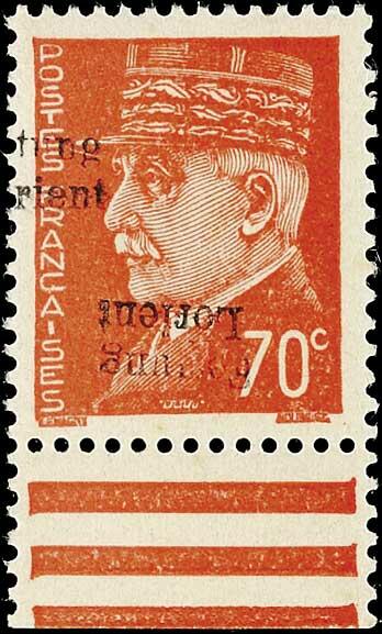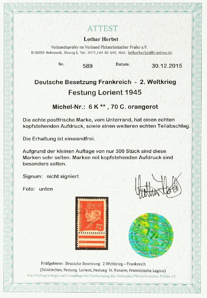 | Zusatzinformationen und Suchstichworte: | Dr. Reinhard Fischer 193. Auktion 21. - 22. Juli 2023 Los 4621 Deutsche Besetzung II. WK Frankreich Lorient 70 C. Freimarke orange mit Aufdruck "Festung Lorient", Abart "kopfstehender Aufdruck", Unterrandstück, tadellos postfrisch, unsigniert, Fotoattest Lothar Herbst VP (2015): "Die Erhaltung ist einwandfrei. Aufgrund der kleinen Auflage von nur 300 Marken sind diese sehr selten." Ausruf 600,00 EUR |