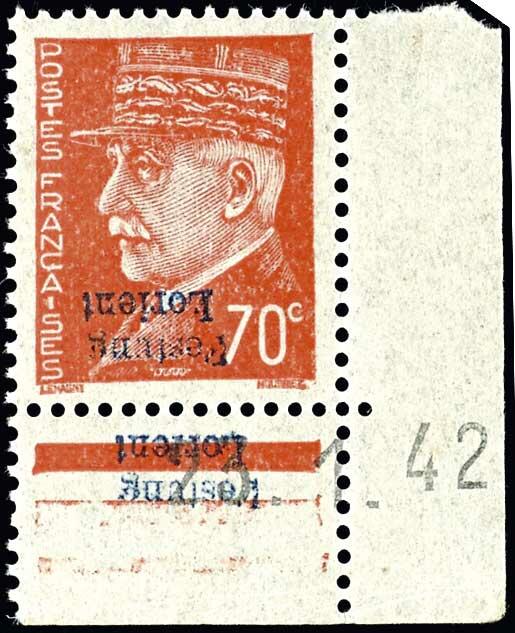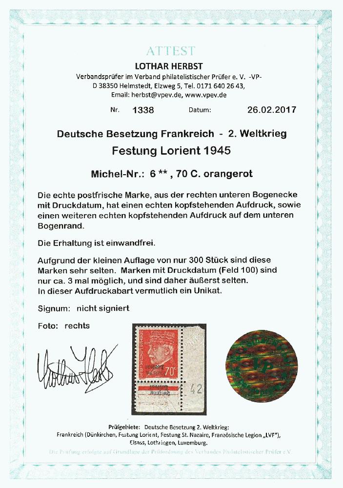| Zusatzinformationen und Suchstichworte: | Dr. Reinhard Fischer 193. Auktion 21. - 22. Juli 2023 Los 4622 Deutsche Besetzung II. WK Frankreich Lorient 70 C. Freimarke orange mit Aufdruck "Festung Lorient" als Eckrandstück unten rechts mit Druckdatum "23.1.42", Abart "kopfstehender Aufdruck", tadellos postfrisch, unsigniert, Auflage nur 300 Exemplare - davon nur wenige mit kopfstehendem Aufdruck - als Eckrandstück mit Druckdatum und Abart "kopfstehender Aufdruck" vermutlich UNIKAT!, Fotoattest Lothar Herbst VP (2017): "Die Erhaltung ist einwandfrei." Ausruf 1.200,00 EUR |