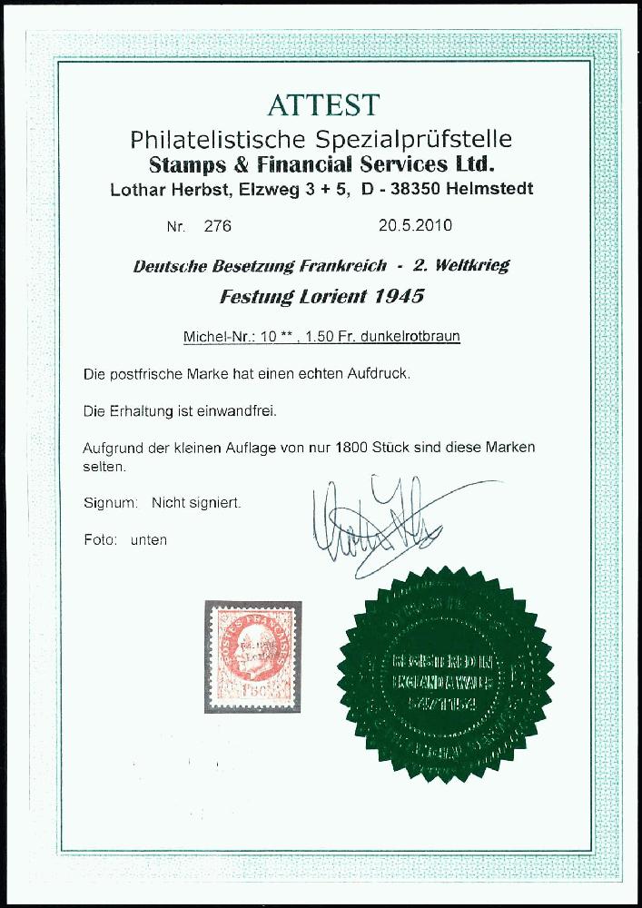 | Zusatzinformationen und Suchstichworte: | Dr. Reinhard Fischer 193. Auktion 21. - 22. Juli 2023 Los 4625 Deutsche Besetzung II. WK Frankreich Lorient 1,50 Fr. Freimarke braun mit Aufdruck "Festung Lorient", tadellos postfrisch und ohne jegliche Signaturen, Auflage nur 1.800 Stück, Fotoattest Lothar Herbst (2010): "Die Erhaltung ist einwandfrei." Mi. 600.- Ausruf 180,00 EUR |