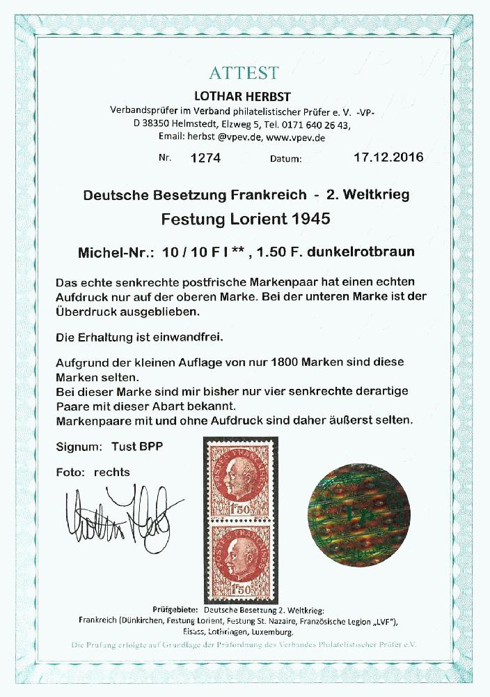 | Zusatzinformationen und Suchstichworte: | Dr. Reinhard Fischer 193. Auktion 21. - 22. Juli 2023 Los 4626 Deutsche Besetzung II. WK Frankreich Lorient 1,50 Fr. dunkelrotbraun mit Aufdruck "Festung Lorient" im senkrechten Paar mit Abart "fehlender Aufdruck auf der unteren Marke", tadellos postfrisch, diese Paare "mit und ohne Aufdruck" sind bei Festung Lorient sehr selten und bei der Wertstufe zu 1,50 Fr. trotz intensiver Forschung nur in derzeit vier Exemplaren bekannt! Der Nachweis dieser Stücke führt nun dazu, dass diese Abart im Mi. 2017 katalogisiert wird, in jedem Fall ein sehr seltenes Markenpaar! geprüft Tust BPP und Fotoattest Lothar Herbst VP (2016): "Die Erhaltung ist einwandfrei. Aufgrund der kleinen Auflage von nur 1.800 Marken sind diese Marken selten. Bei dieser Marke sind mir bisher nur vier senkrechte derartige Paare mit dieser Abart bekannt. Markenpaare mit und ohne Aufdruck sind daher äußerst selten.", Mi. 5.000.- Ausruf 700,00 EUR |