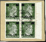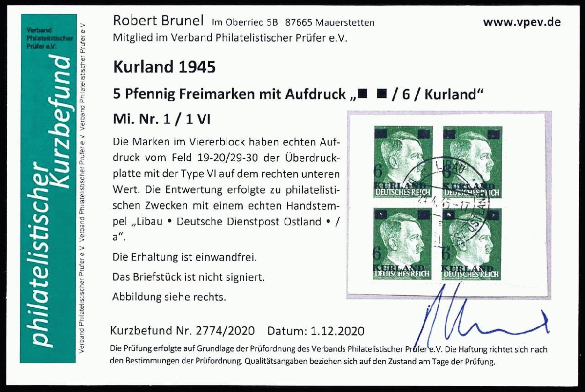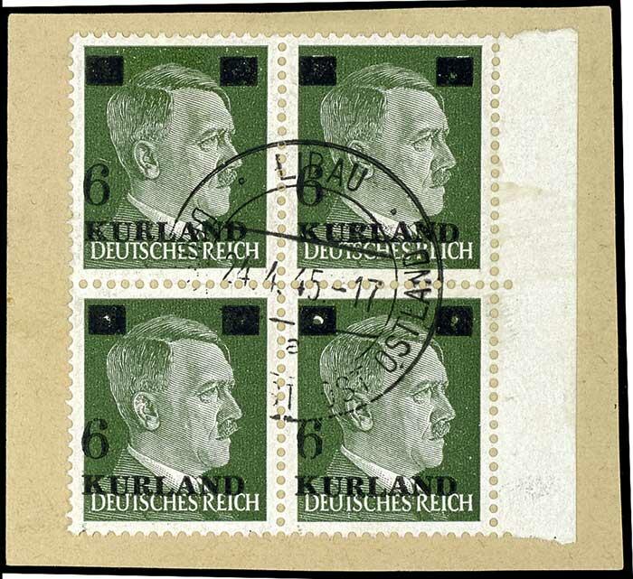 | Zusatzinformationen und Suchstichworte: | Dr. Reinhard Fischer 193. Auktion 21. - 22. Juli 2023 Los 4703 Deutsche Besetzung II. WK Kurland 6 auf 5 Pfg Hitler, Viererblock vom rechten Bogenrand, drei Werte Type I und rechte untere Marke in seltener Type VI, entwertet "Libau Deutsche Dienstpost Ostland / a" auf Briefstück, Fotobefund Brunel VP (2020): "Die Entwertung erfolgte zu philatelistischen Zwecken ... Die Erhaltung ist einwandfrei.", Mi. 540.- Ausruf 150,00 EUR |