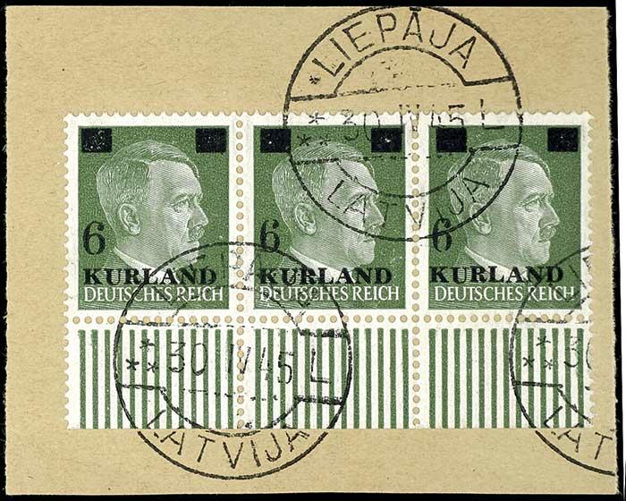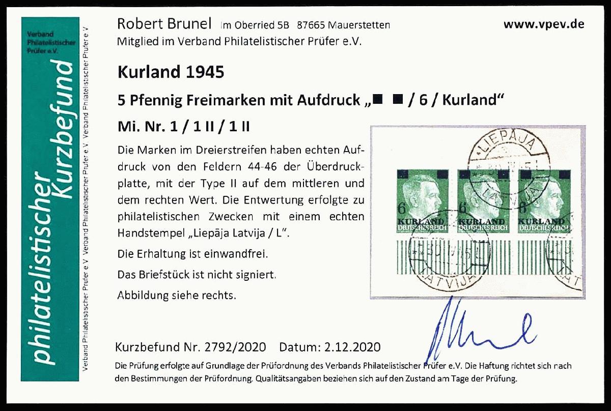 | Zusatzinformationen und Suchstichworte: | Dr. Reinhard Fischer 193. Auktion 21. - 22. Juli 2023 Los 4705 Deutsche Besetzung II. WK Kurland 6 auf 5 Pfg Hitler, waagerechter Dreierstreifen vom Walzenunterrand mit den Feldern 44 - 46 der Druckplatte - somit die beiden rechten Marken mit Aufdruck in Type II, gestempelt "Liepaja Latvija / L" auf Briefstück, Fotobefund Brunel VP (2020): "Die Entwertung erfolgte zu philatelistischen Zwecken ... Die Erhaltung ist einwandfrei.", Mi. 380.- Ausruf 90,00 EUR |