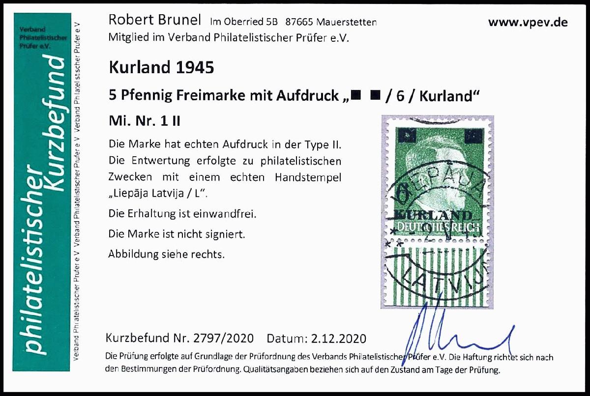| Zusatzinformationen und Suchstichworte: | Dr. Reinhard Fischer 193. Auktion 21. - 22. Juli 2023 Los 4711 Deutsche Besetzung II. WK Kurland 6 auf 5 Pfg Hitler mit Aufdruck in Type II, entwertet "Liepaja Latvija / L", Fotobefund Brunel VP (2020): "Die Entwertung erfolgte zu philatelistischen Zwecken ... Die Erhaltung ist einwandfrei.", Mi. 150.- Ausruf 35,00 EUR |
