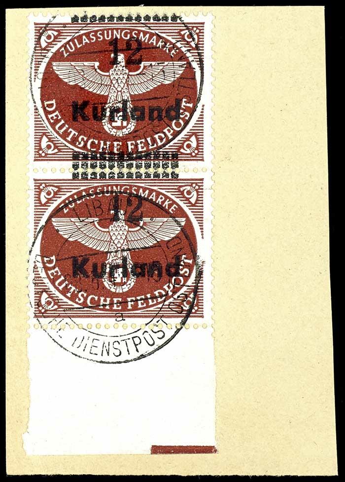 | Zusatzinformationen und Suchstichworte: | Dr. Reinhard Fischer 193. Auktion 21. - 22. Juli 2023 Los 4721 Deutsche Besetzung II. WK Kurland 12 auf Feldpostpäckchenzulassungsmarke gezähnt, senkrechtes Paar, entwertet "Libau Deutsche Dienstpost / a" auf Briefstück, Fotobefund Brunel VP (2020): "Die Erhaltung ist einwandfrei.", Mi. 180.- Ausruf 45,00 EUR |