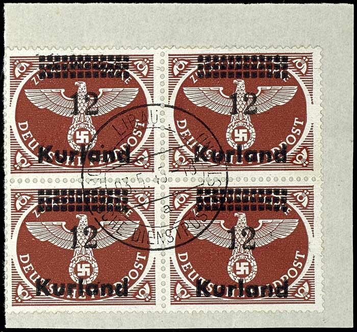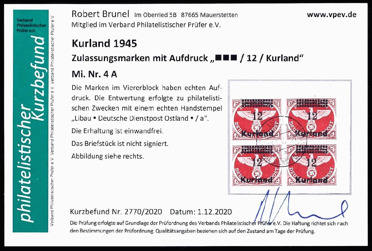 | Zusatzinformationen und Suchstichworte: | Dr. Reinhard Fischer 193. Auktion 21. - 22. Juli 2023 Los 4723 Deutsche Besetzung II. WK Kurland 12 auf Feldpostpäckchenzulassungsmarke gezähnt, Viererblock, entwertet "Libau Deutsche Dienstpost / a" auf Briefstück, Fotobefund Brunel VP (2020): "Die Erhaltung ist einwandfrei.", Mi. 360.- Ausruf 90,00 EUR |