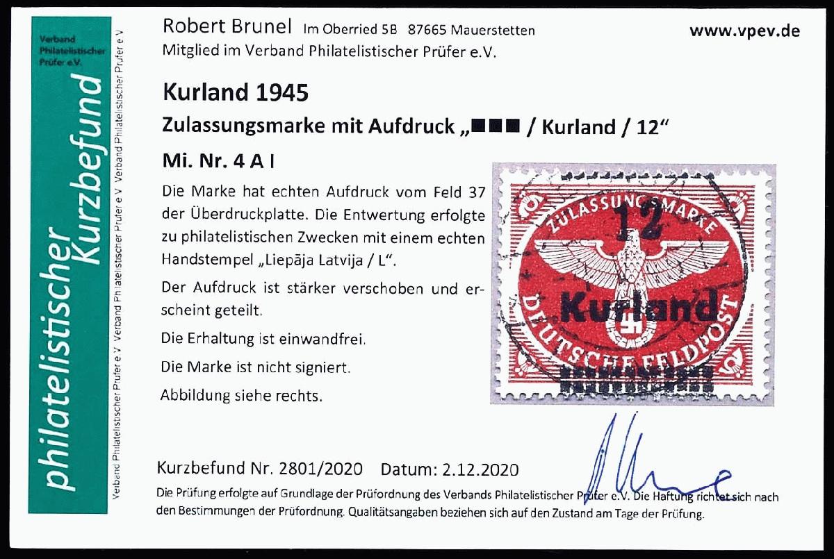 | Zusatzinformationen und Suchstichworte: | Dr. Reinhard Fischer 193. Auktion 21. - 22. Juli 2023 Los 4724 Deutsche Besetzung II. WK Kurland 12 auf Feldpostpäckchenzulassungsmarke, gezähnt, Feld 37 - kurzer Fuß der 2, entwertet "Liepaja Latvija / L", Fotobefund Brunel VP (2020): "Die Entwertung erfolgte zu philatelistischen Zwecken ... Die Erhaltung ist einwandfrei.", Mi. 180.- Ausruf 50,00 EUR |