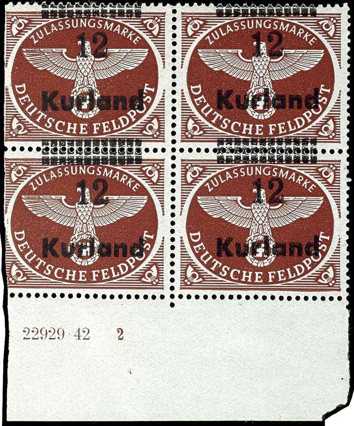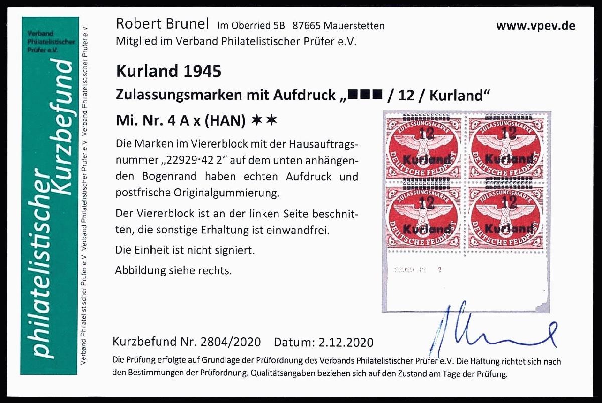 | Zusatzinformationen und Suchstichworte: | Dr. Reinhard Fischer 193. Auktion 21. - 22. Juli 2023 Los 4725 Deutsche Besetzung II. WK Kurland 12 auf Feldpostpäckchenzulassungsmarke, gezähnt, Viererblock vom unteren Bogenrand mit HAN 22929.42 2", links beschnitten, postfrisch, Fotobefund Brunel VP (2020), Mi. 480.-+ Ausruf 150,00 EUR |
