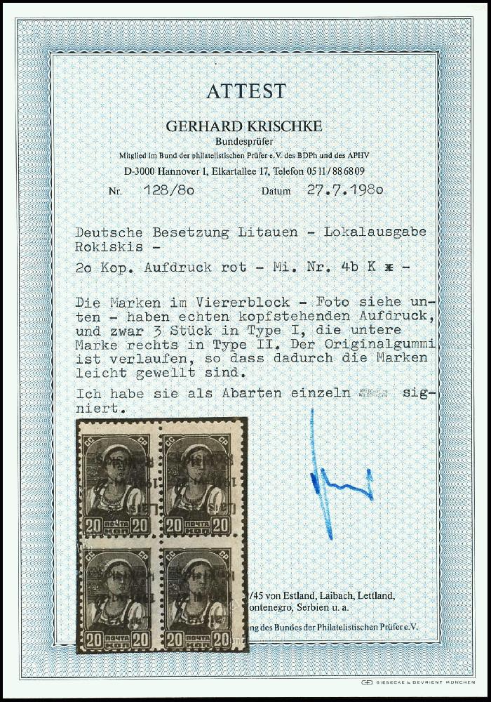 | Zusatzinformationen und Suchstichworte: | Dr. Reinhard Fischer 193. Auktion 21. - 22. Juli 2023 Los 4756 Deutsche Besetzung II. WK Litauen Rokiskis 20 Kop. Freimarke mit rotem Aufdruck, Abart "kopfstehender Aufdruck", Viererblock, ungebraucht mit Originalgummierung - diese etwas verlaufen und daher die Marken leicht gewellt, Fotoattest Krischke BPP, Mi. 1.000.- für postfrisch Ausruf 170,00 EUR |