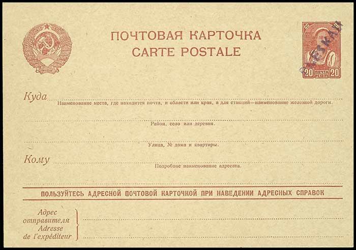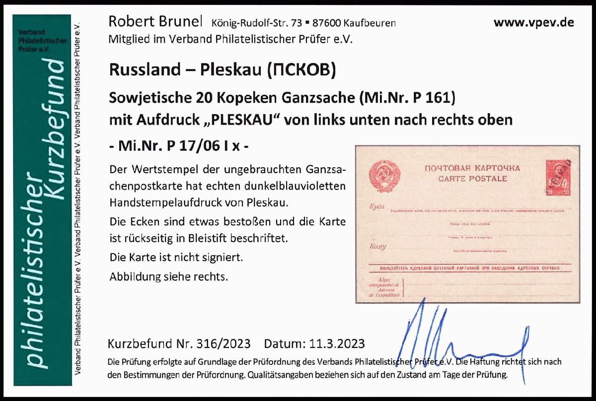 | Zusatzinformationen und Suchstichworte: | Dr. Reinhard Fischer 193. Auktion 21. - 22. Juli 2023 Los 4779 Deutsche Besetzung II. WK Russland - Pleskau 20 Kopeken Ganzsachenkarte mit Aufdruck "PLESKAU" von links unten nach rechts oben, Werbespruch 06, ungebraucht, rücks. in Bleistift beschriftet und Ecken bestoßen, Fotobefund Robert Brunel VP (2023), Mi. 175.- Ausruf 60,00 EUR |