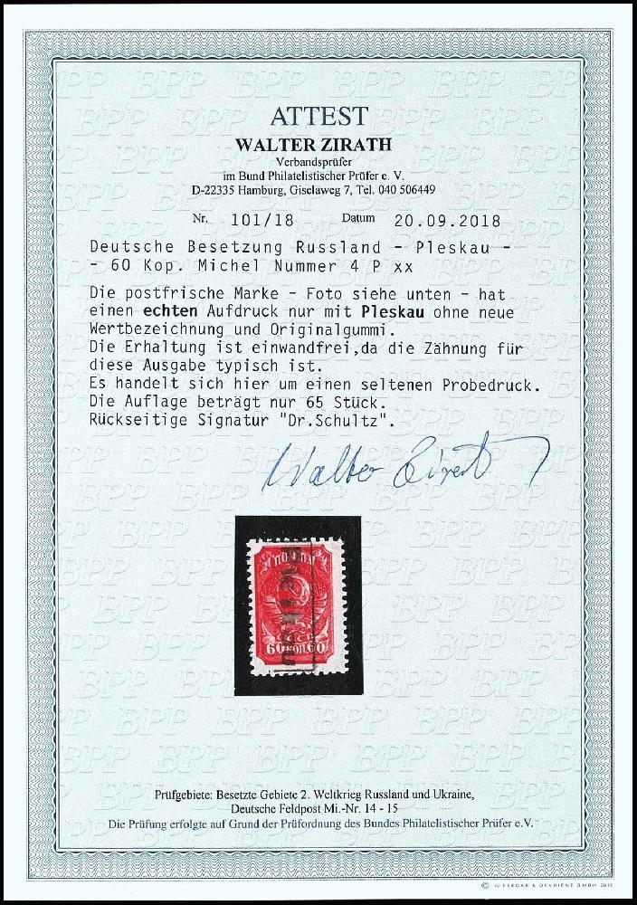 | Zusatzinformationen und Suchstichworte: | Dr. Reinhard Fischer 193. Auktion 21. - 22. Juli 2023 Los 4783 Deutsche Besetzung II. WK Russland - Pleskau 60 K lilakarmin Freimarke "Werktätige", mit Probeaufdruck "Pleskau" im Rahmen ohne neue Wertbezeichnung, postfrisch, tadellose Erhaltung. Die Auflage dieses Probeaufdrucks beträgt nur 65 Stück! Große Rarität der deutschen Besetzungsausgaben im II. Weltkrieg. Fotoattest Zirath BPP (2018): "Die Erhaltung ist einwandfrei." Ausruf 550,00 EUR |