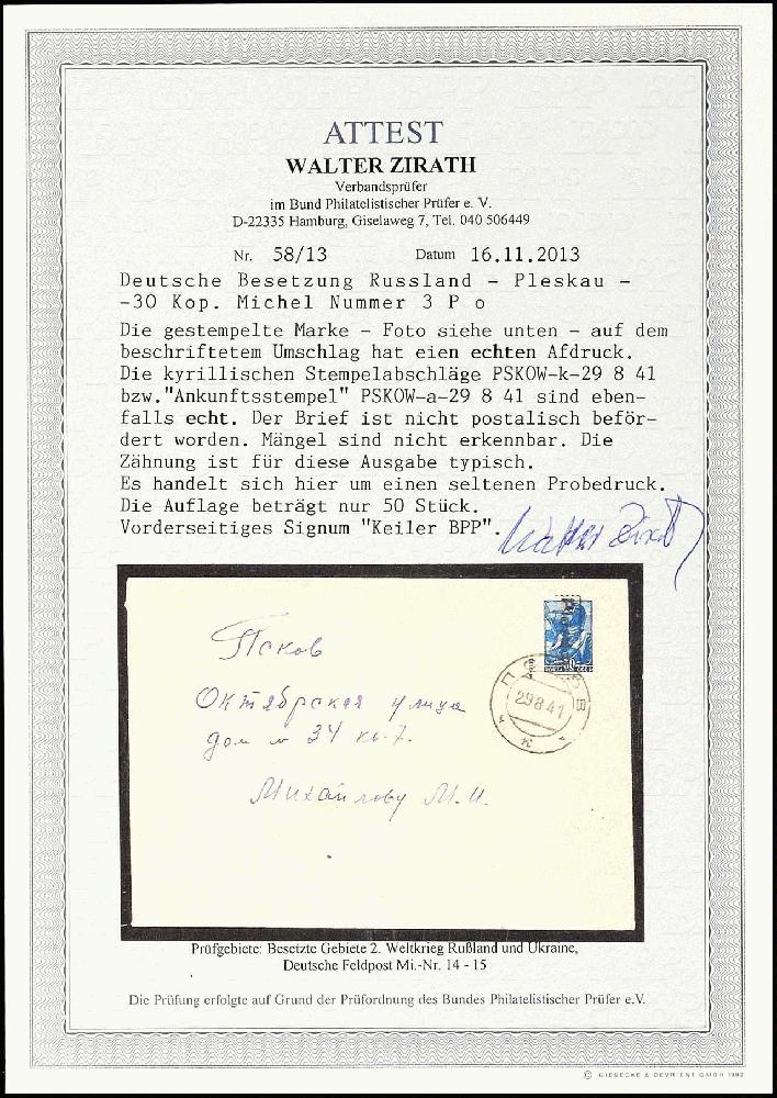 | Zusatzinformationen und Suchstichworte: | Dr. Reinhard Fischer 193. Auktion 21. - 22. Juli 2023 Los 4785 Deutsche Besetzung II. WK Russland - Pleskau 30 Kop. Probedruck tadellos gestempelt auf (postalisch nicht befördertem) Brief. Fotoattest Zirath BPP: "Aufdruck und Stempel sind echt. ...Mängel sind nicht erkennbar. Es handelt sich um einen seltenen Probedruck. Die Auflage beträgt nur 50 Stück." Mi. 4.000.- für lose bzw. 4.500.- für Brief Ausruf 1.200,00 EUR |