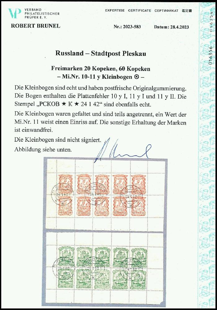 | Zusatzinformationen und Suchstichworte: | Dr. Reinhard Fischer 193. Auktion 21. - 22. Juli 2023 Los 4789 Deutsche Besetzung II. WK Russland - Pleskau 20 Kop. und 60 Kop. "Stadtwappen und Kathedrale", graues holzhaltiges Papier, Kleinbogensatz, dabei die Plattenfehler 10 I, 11 I und 11 II, gestempelt "PCKOB * K * 24 1 42", gefaltet und teils angetrennt, ein Wert Mi.-Nr. 11 weist einen Einriss auf, ansonsten einwandfreie Erhaltung, Expertise Robert Brunel VP (2023), Mi. 680.- (inkl. Plattenfehler) Ausruf 140,00 EUR |