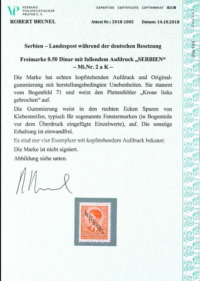 | Zusatzinformationen und Suchstichworte: | Dr. Reinhard Fischer 193. Auktion 21. - 22. Juli 2023 Los 4800 Deutsche Besetzung II. WK Serbien 0,50 Din Freimarke rotorange, mit kopfstehendem Aufdruck "SERBIEN", Marke von Bogenfeld 71 mit zusätzlicher Abart "Krone links gebrochen". Die originale Gummierung weist die für sogenannte "Fenstermarken" (in Bogenteile vor dem Überdruck eingefügte Einzelwerte) Spuren auf, sonst in einwandfreier Erhaltung. Es sind nur 4 Exemplare mit kopfstehendem Aufdruck bekannt - mit Plattenfehler handelt es sich um ein Unikat! Allergrößte Rarität der deutschen Besetzungsausgaben im II. Weltkrieg. Fotoattest Dr.Zydek BPP und Fotoattest Robert Brunel VP (2018): "Die sonstige Erhaltung ist einwandfrei." Ausruf 2.000,00 EUR |