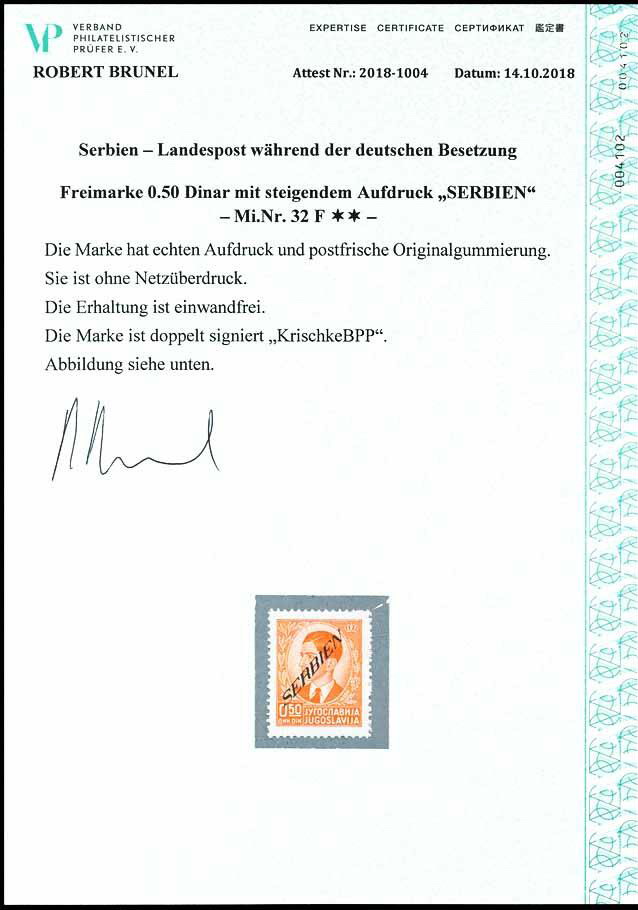 | Zusatzinformationen und Suchstichworte: | Dr. Reinhard Fischer 193. Auktion 21. - 22. Juli 2023 Los 4829 Deutsche Besetzung II. WK Serbien 0,50 Din Freimarke rotorange, mit Abart fehlender Netzüberdruck, postfrisch mit vollem Originalgummi, tadellose Erhaltung. Große Rarität der deutschen Besetzungsausgaben im II. Weltkrieg. geprüft Krischke BPP, Fotoattest Uwe Kleymann und neuestes Fotoattest Robert Brunel VP: "Die Erhaltung ist einwandfrei." Ausruf 800,00 EUR |