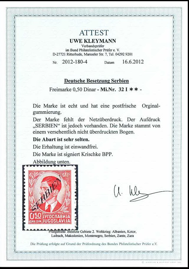 | Prüfer: | Kleymann, Uwe (BPP (Bund Philatelistischer Prüfer)) |