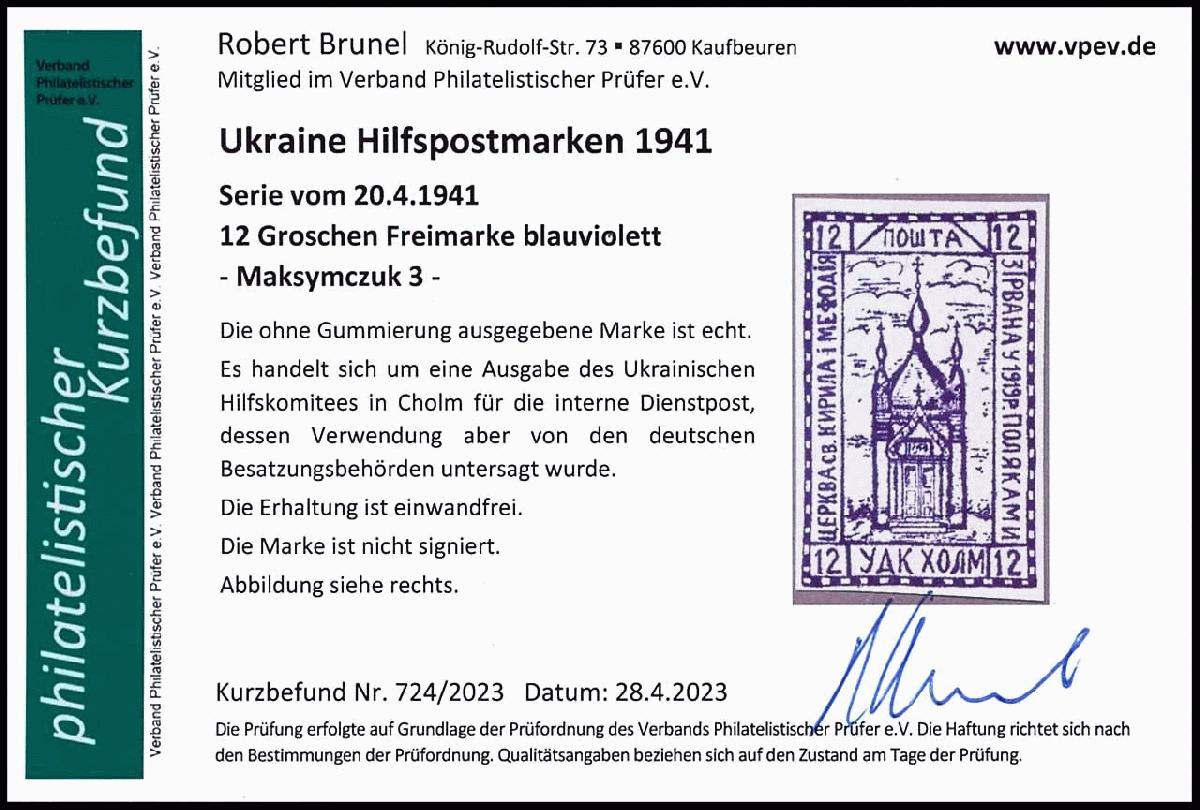 | Prüfgebiet: | Deutsche Besetzung WK 2 Ukraine Hilfspostmarken 1941 |