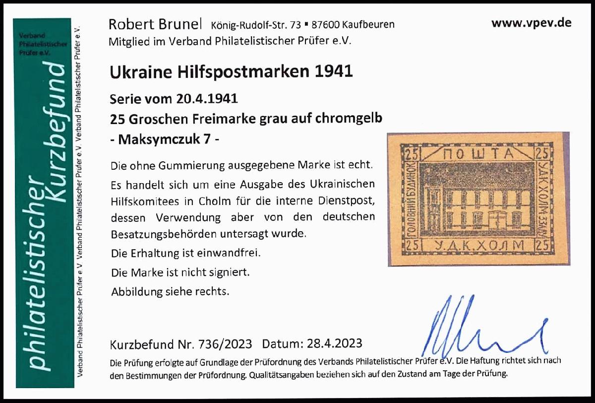| Zusatzinformationen und Suchstichworte: | Dr. Reinhard Fischer 193. Auktion 21. - 22. Juli 2023 Los 4932 Deutsche Besetzung II. WK Ukraine 25 Groschen grau auf chromgelb, Cholm Ausgabe 20.4.1941, Ausgabe des Ukrainischen Hilfskomitees in Chom für die interne Dienstpost - dessen Verwendung aber von den deutschen Besatzungsbehörden untersagt wurde, ungebraucht ohne Gummierung - wie verausgabt, Fotobefund Robert Brunel VP (2023): "Die Erhaltung ist einwandfrei.", selten angeboten! Ausruf 150,00 EUR |