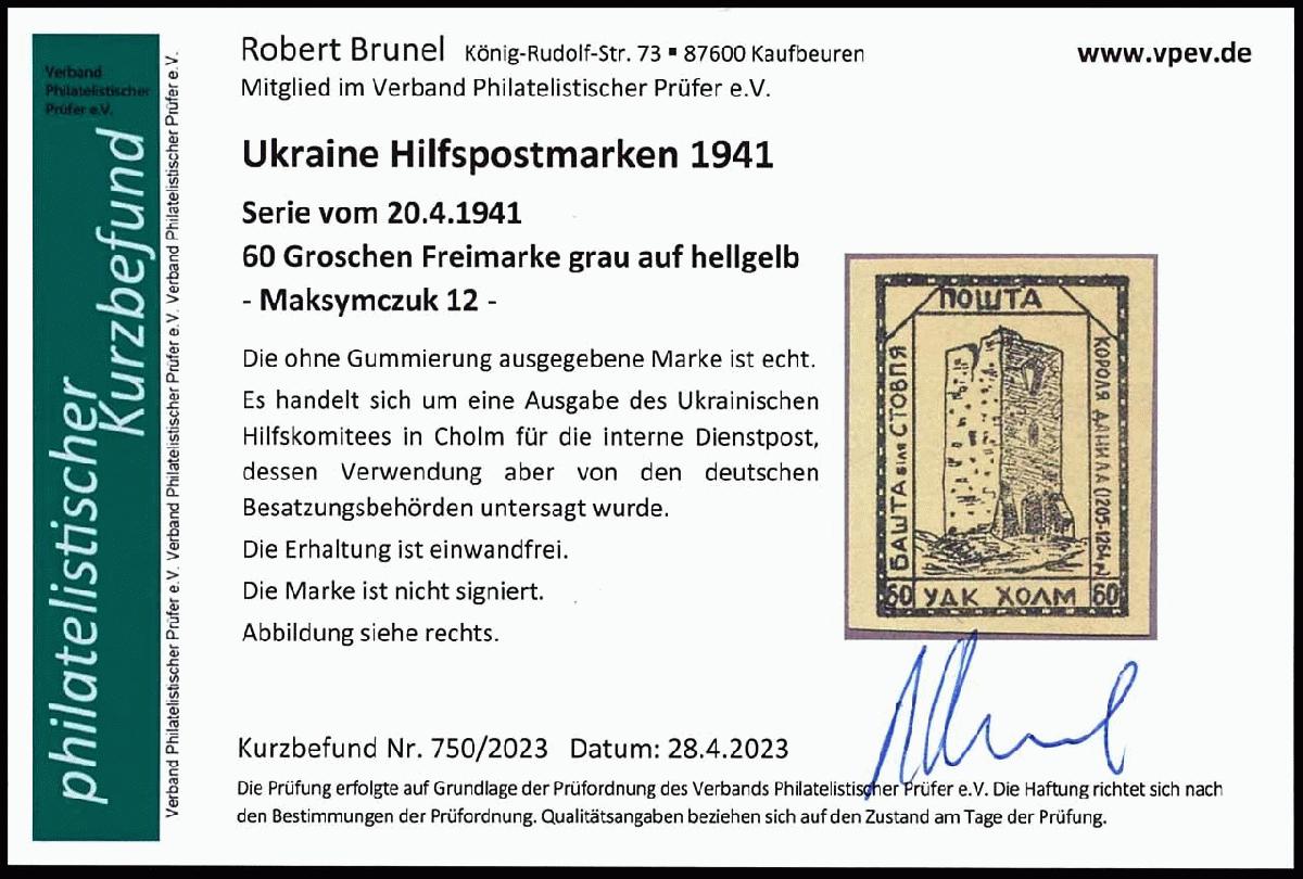 | Zusatzinformationen und Suchstichworte: | Dr. Reinhard Fischer 193. Auktion 21. - 22. Juli 2023 Los 4939 Deutsche Besetzung II. WK Ukraine 60 Groschen grau auf hellgelb, Cholm Ausgabe 20.4.1941, Ausgabe des Ukrainischen Hilfskomitees in Chom für die interne Dienstpost - dessen Verwendung aber von den deutschen Besatzungsbehörden untersagt wurde, ungebraucht ohne Gummierung - wie verausgabt, Fotobefund Robert Brunel VP (2023): "Die Erhaltung ist einwandfrei.", selten angeboten! Ausruf 150,00 EUR |