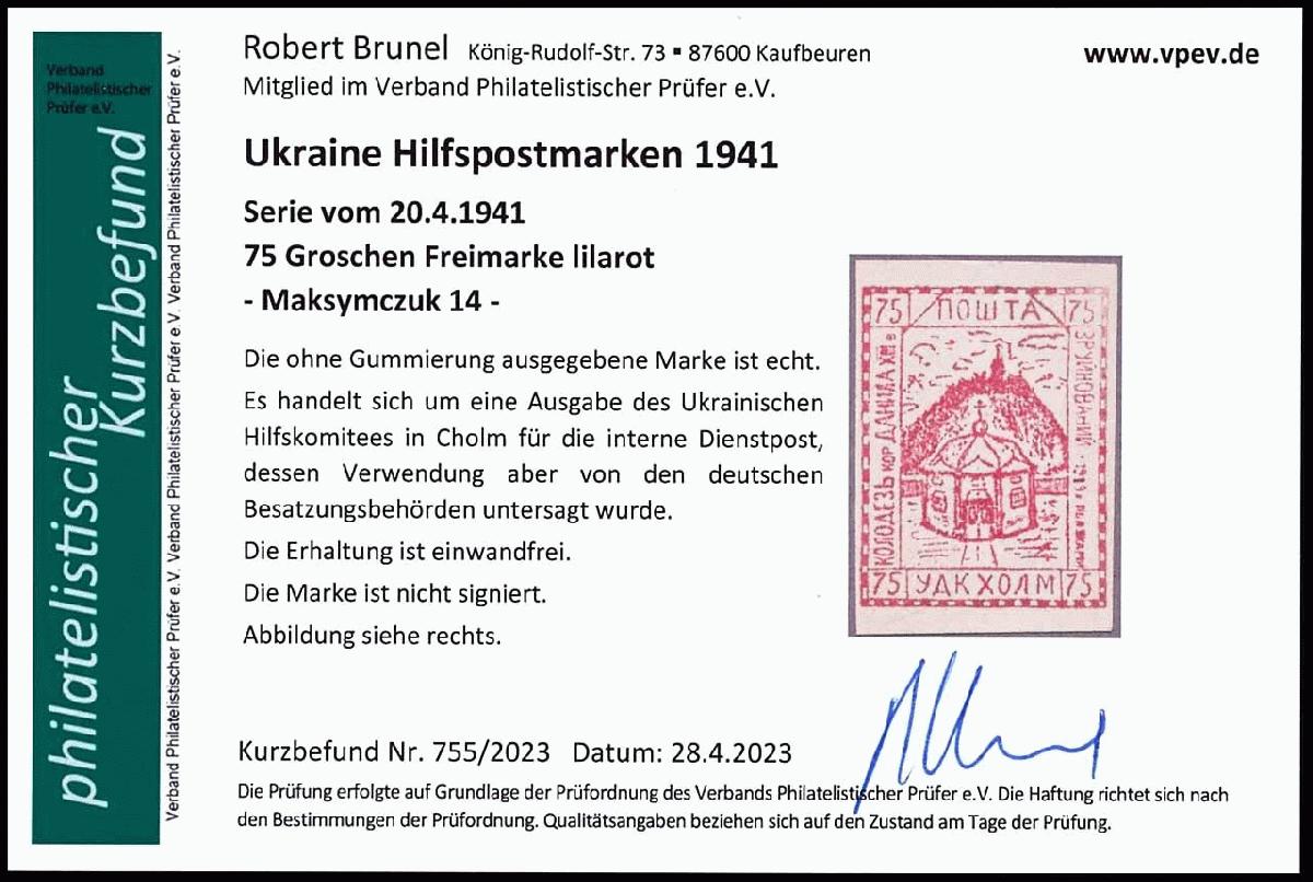 | Prüfgebiet: | Deutsche Besetzung WK 2 Ukraine Hilfspostmarken 1941 |