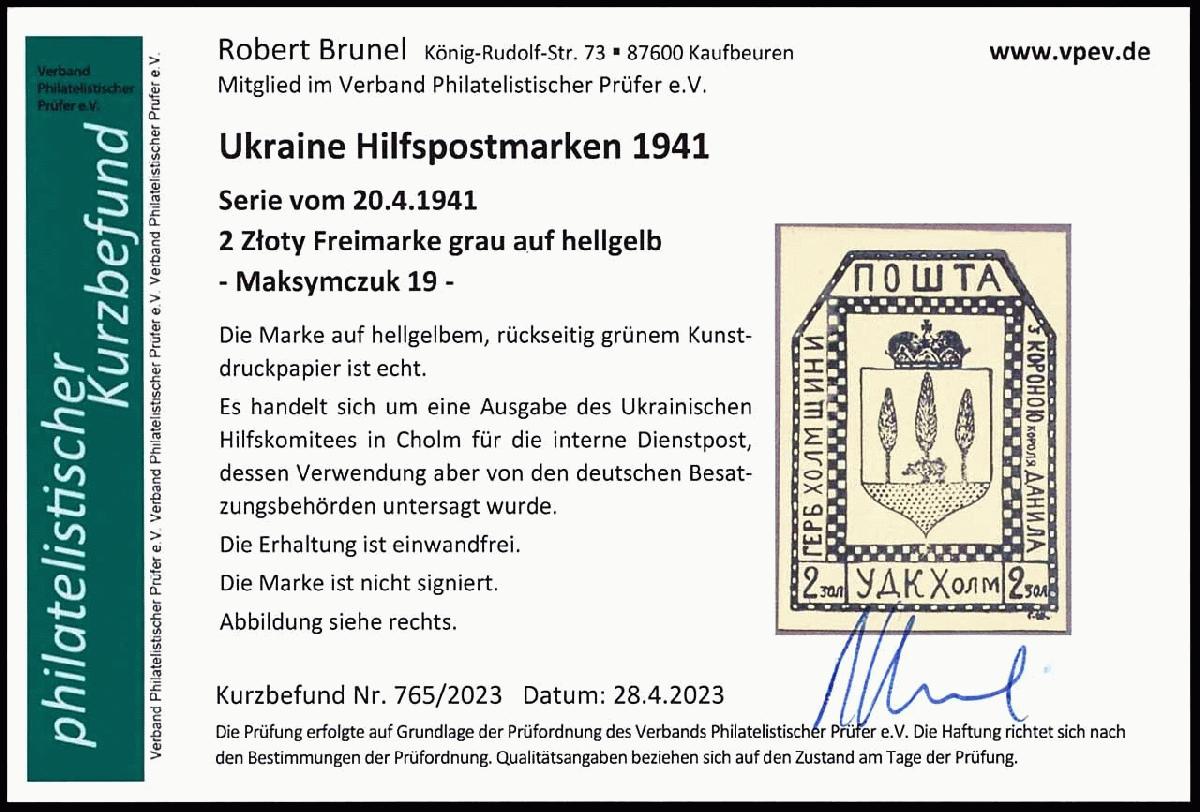 | Zusatzinformationen und Suchstichworte: | Dr. Reinhard Fischer 193. Auktion 21. - 22. Juli 2023 Los 4948 Deutsche Besetzung II. WK Ukraine 2 Zloty Freimarke grau auf hellgelbem Kunstdruckpapier, rückseitig grün, Cholm Ausgabe 20.4.1941, Ausgabe des Ukrainischen Hilfskomitees in Chom für die interne Dienstpost - dessen Verwendung aber von den deutschen Besatzungsbehörden untersagt wurde, ungebraucht ohne Gummierung, Fotobefund Robert Brunel VP (2023): "Die Erhaltung ist einwandfrei.", selten angeboten! Ausruf 150,00 EUR |