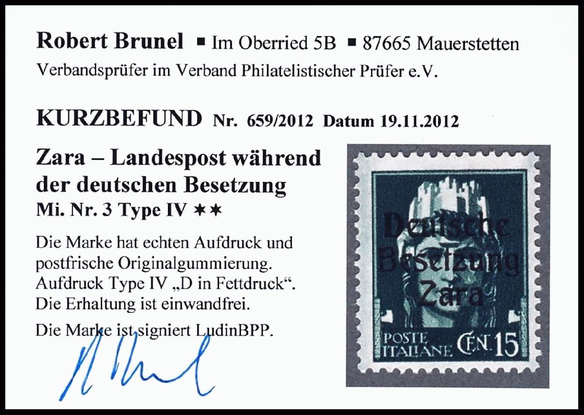 | Zusatzinformationen und Suchstichworte: | Dr. Reinhard Fischer 193. Auktion 21. - 22. Juli 2023 Los 4976 Deutsche Besetzung II. WK Zara 15 Cent Freimarke, Aufdruck in seltener Type IV, tadellos postfrisch, Fotobefund Brunel VP: "Die Erhaltung ist einwandfrei.", Mi. 198.- Ausruf 60,00 EUR |